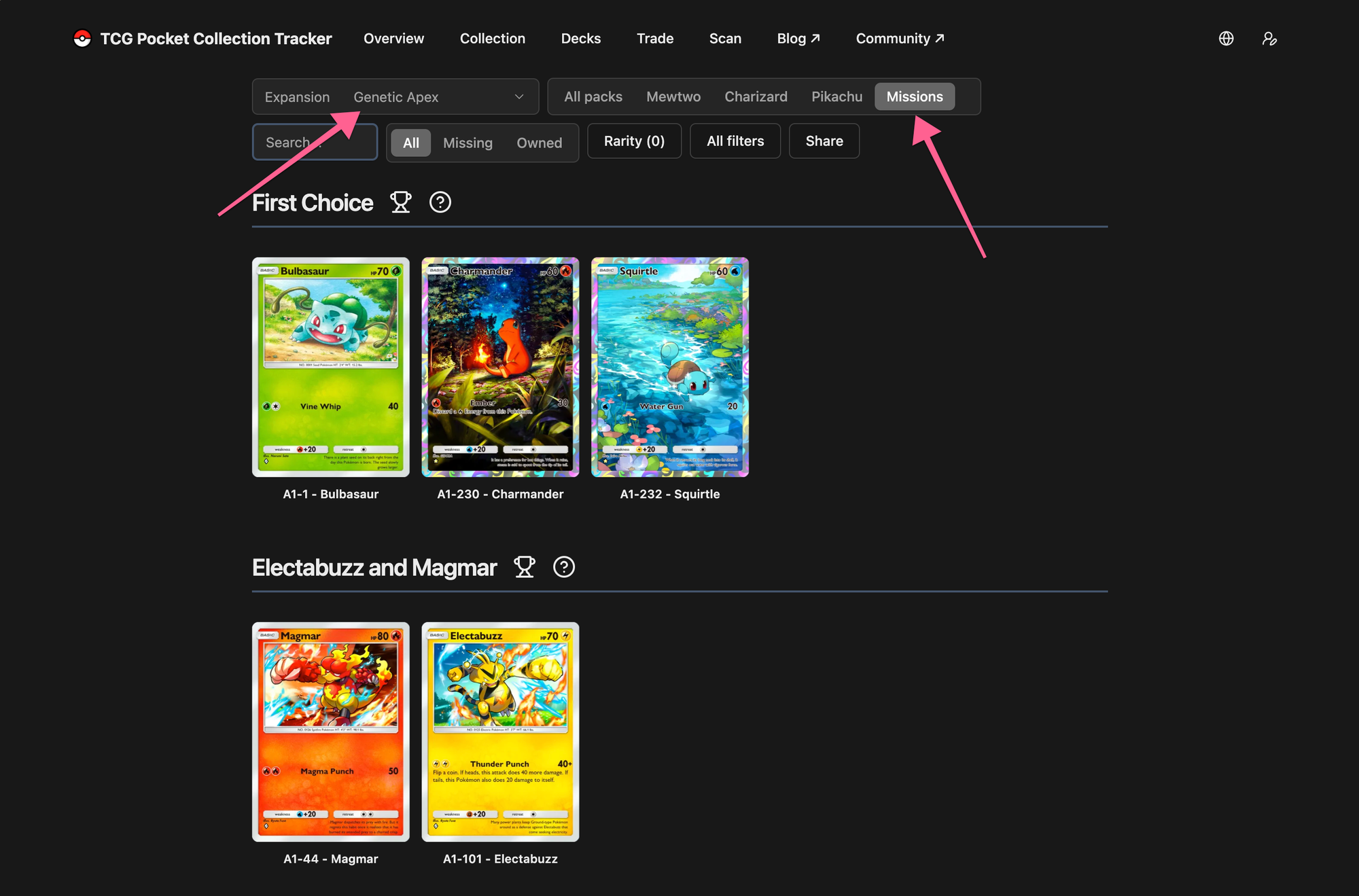 Missions reward tokens, hourglasses, or rental decks. Some missions are hidden in the app until you complete them, but you can see the full list on our site by filtering an expansion and checking the missions tab. Most missions unlock naturally as you collect cards, but sometimes you’ll need duplicates, so keep that in mind before trading extras.